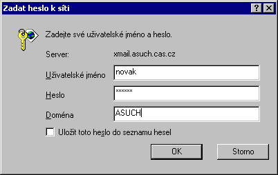 Do prvního řádku vyplňte své uživatelské jméno, do druhého heslo a do třetího doménu („ASUCH“).